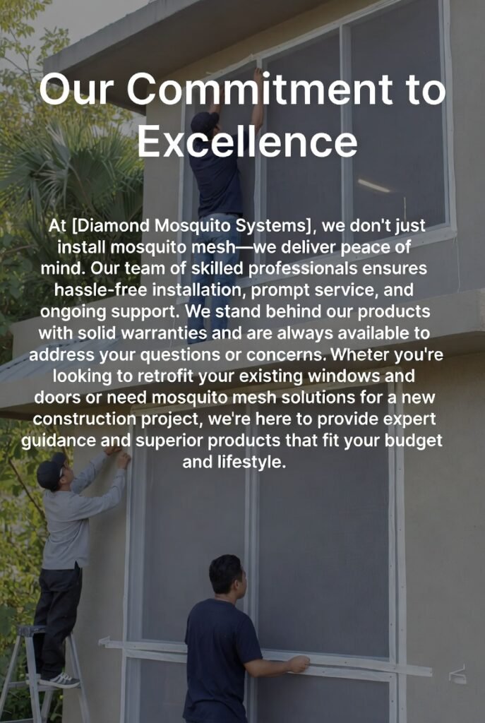 Welcome to [Diamond mosquito systems], where we’ve been transforming homes and commercial spaces with high-quality mosquito mesh doors and windows that combine protection, durability, and style. With years of experience in the industry, we understand that your family’s health and comfort are paramount, which is why we’re committed to delivering solutions that keep unwanted insects out while letting fresh air flow freely through your space.